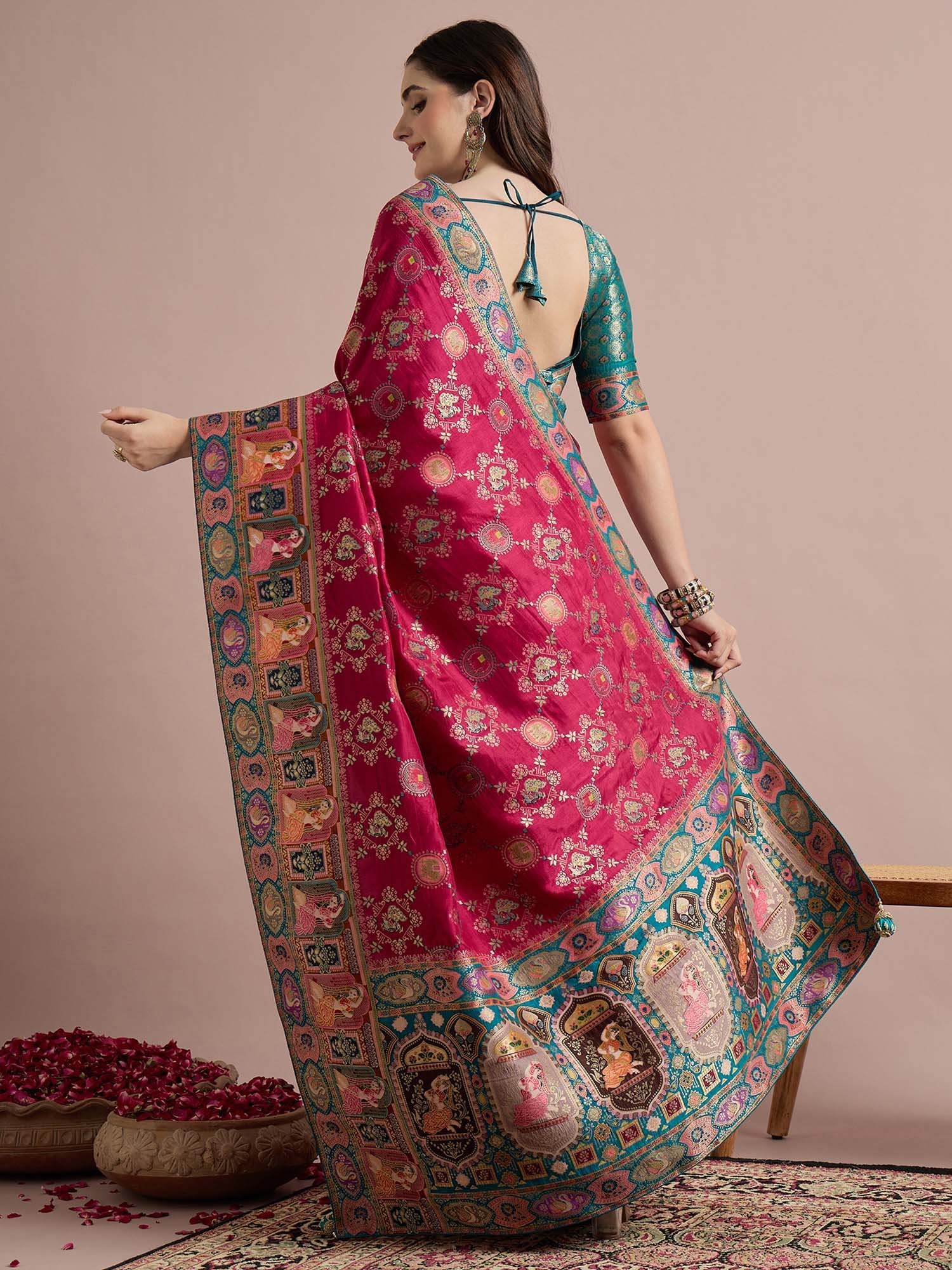 Pink Woven Viscose Saree with Unstitched Blouse