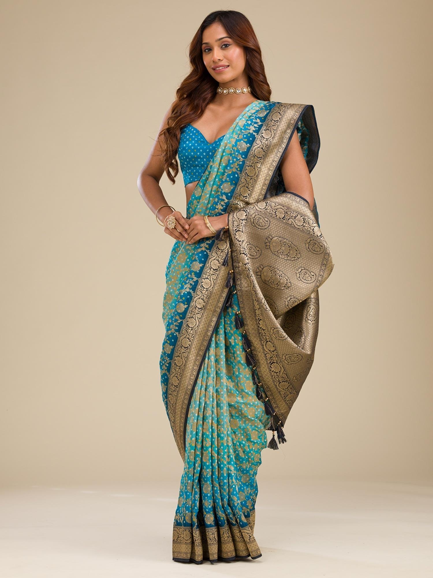 Turquoise Blue Zari Georgette Saree with Unstitched Blouse