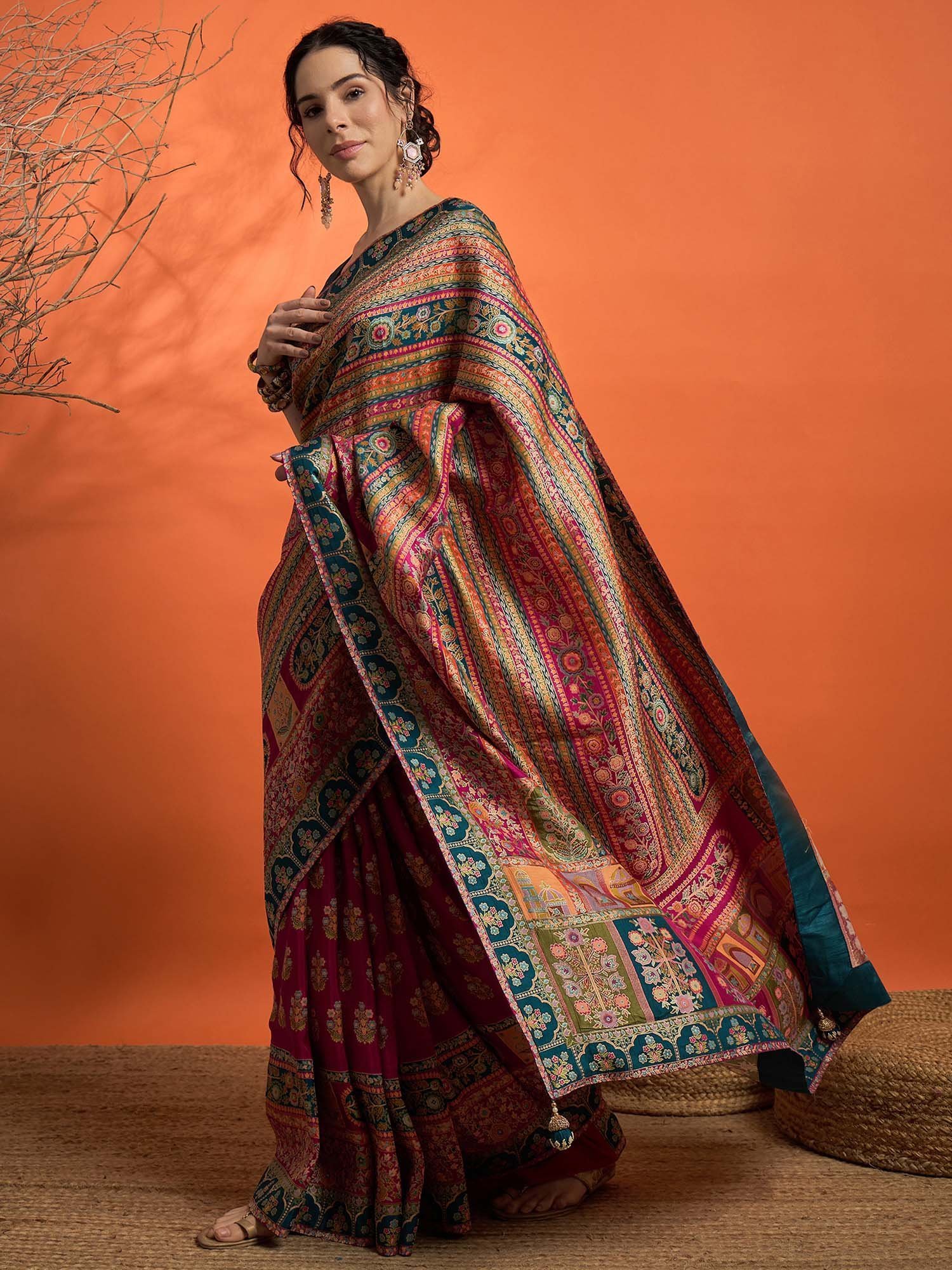 The Elegant Embellished With A Luxurious Purple Saree with Unstitched Blouse