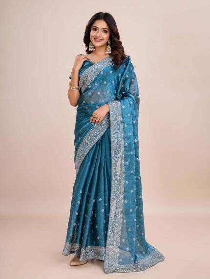 ₹1,099.00 Incl GST.Ayra Olive Floral Printed Organza Saree with Unstitched Blouse
